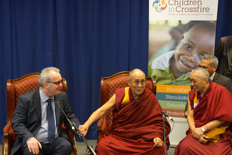 达赖喇嘛尊者在爱尔兰“战火中的儿童”慈善基金会创办人,理查•摩尔的陪同下,于4月18日参访了当地阿尔斯特大学(University of Ulster Magee),以“和平与冲突的哲学”为主题发表了演说。