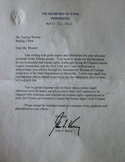 据西藏作家唯色博客消息,5月19日晚,在美国驻中国大使馆公使王晓岷先生的私人聚会上,王晓岷公使代表国务卿克里向自己颁发了由副国务卿亲自带来的“国际妇女勇气奖”奖座,并宣读了克里国务卿于4月12日写的一封信。