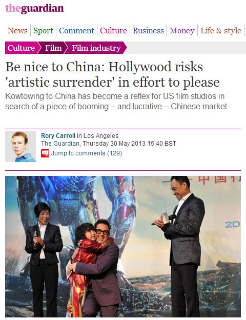 【西藏之声2013年5月31日报导】英国《卫报》昨天(5月30日)刊登了该报记者罗里.卡罗尔(Rory Carroll)就好莱坞为经济利益而向中国低头献媚的报道文章。
