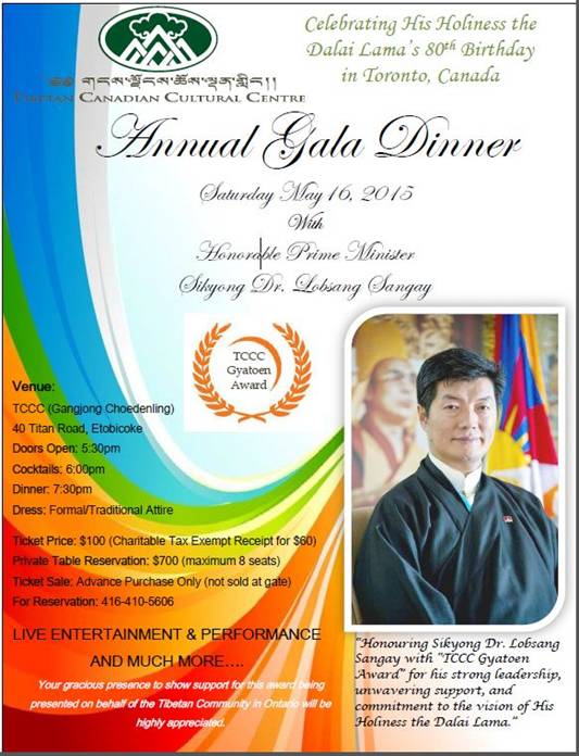 正在加拿大开展参访行程的藏人行政中央司政洛桑森格,于上周六(5月16日)受邀与多名加拿大政界人士及援藏团体代表,共同出席了由加拿大西藏文化中心(Tibetan Canadian Cultural Centre)举办的筹款晚宴。