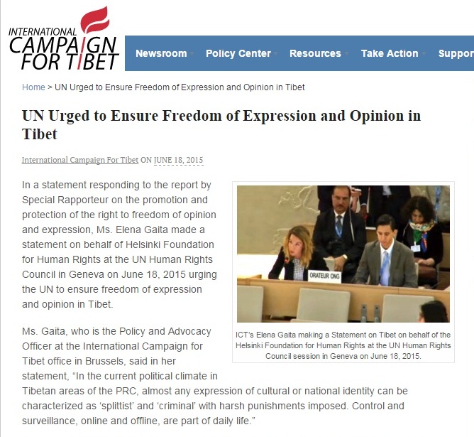 【西藏之声2015年6月19日报道】“国际声援西藏运动”成员,以“赫尔辛基人权基金会”的代表身份,出席了联合国人权理事会第29届会议,并在会上敦促联合国采取行动,保障西藏境内的言论自由。