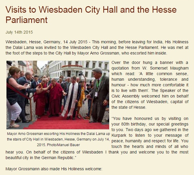 昨天(7月14日)上午,达赖喇嘛尊者受邀参访了德国黑森州议会与威斯巴登市政府,与威斯巴登市市长安诺•格罗斯曼(Arno Grossman)、黑森州议会的议员们进行了见面。