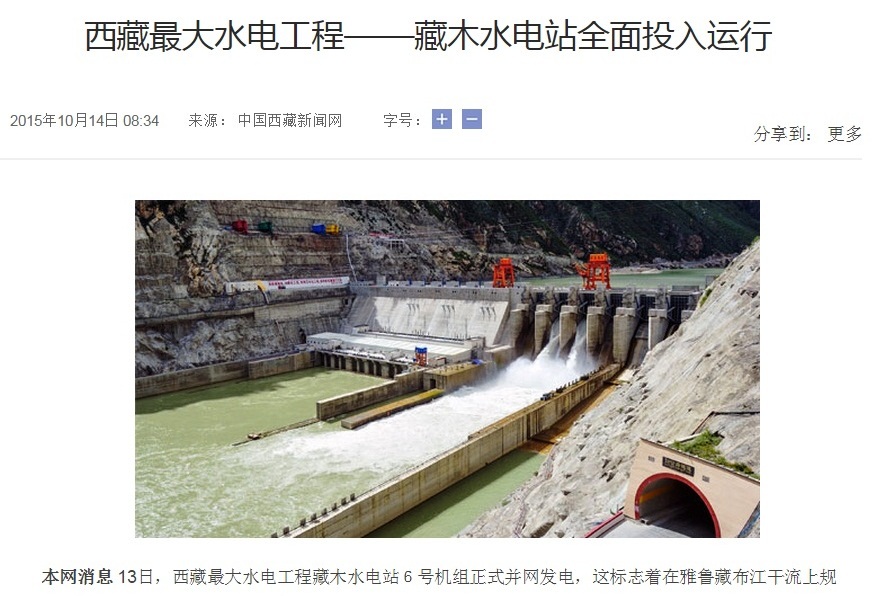 中共官媒报道称,世界上海拔最高的大型水电项目“藏木水电站”位于西藏山南地区,从2014年11月23日首台机组投入运行,到昨天(10月13日) 最后一台机组6号机组投入使用,正式进行商业运行。
