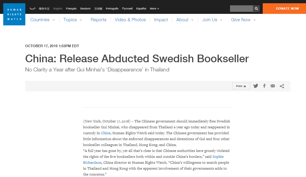 人权观察中国事务负责人索菲·理查森(Sophie Richardson)指出,“已经过了整整一年,大家都非常清楚中共严重地迫害了这五位书店股东以及职员的人权-无论是否在中国的领土上。”