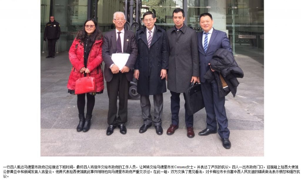 该组织几名成员将抗议信交给马德里市政府工作人员,要求转交市长。而据他们的新闻声明,中共驻西班牙大使馆的官员也向该市政府就此进行了交涉。