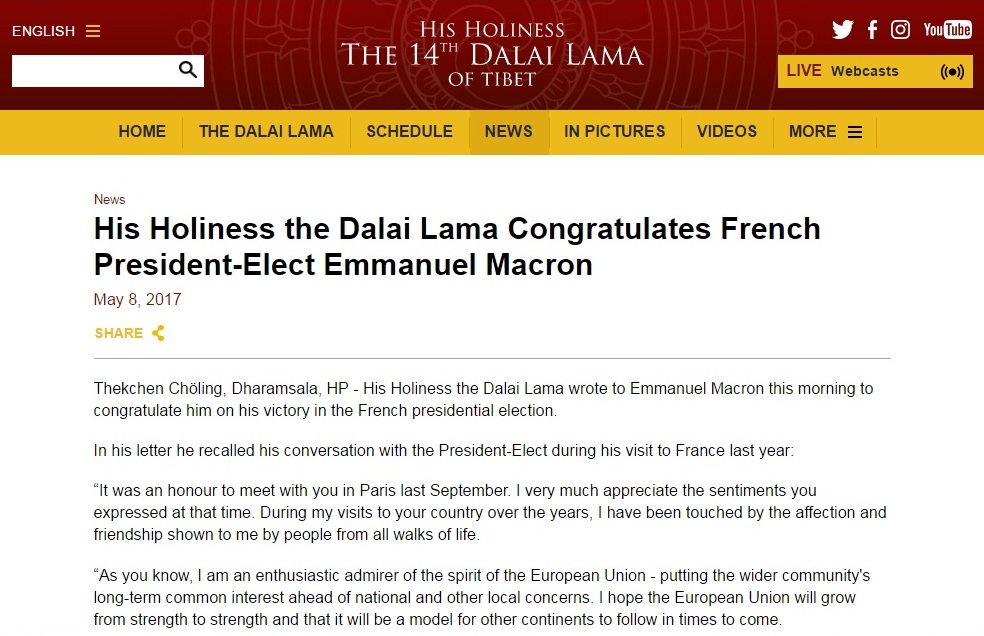 达赖喇嘛官网今天8日刊登声明,对昨天(5月7日)在法国总统大选中胜出的埃马纽埃尔•马克龙表达祝贺。