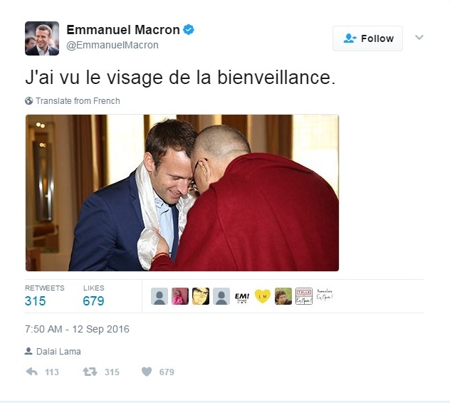 法国当选总统埃马纽埃尔•马克龙去年与尊者见面后,在个人推特上贴出合照,并写着:“我看到了仁慈的脸。”