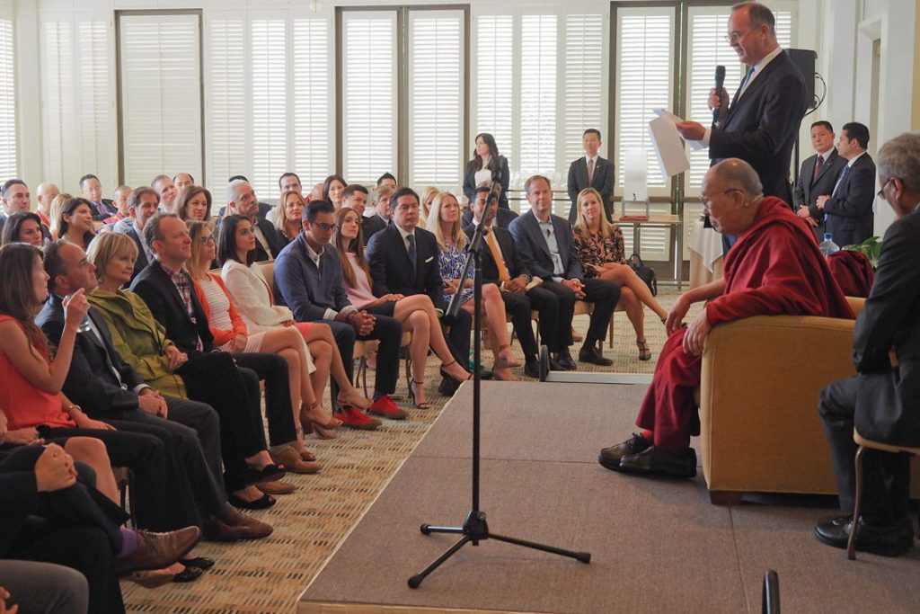 本月19日,达赖喇嘛尊者在美国加州橙县的新港滩,同国际青年总裁协会(Young Presidents Organization,YPO)的成员见面交流,该场活动由安纳翰市市长汤姆•泰特(Tom Tait)主持。