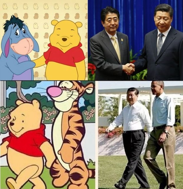中国网友将习近平与奥巴马、安倍晋三握手的合照,同小熊维尼与其他卡通人物握手的图片一并贴出,相似程度带来笑点。小熊维尼也因此成为又一个令中共敏感的词汇,受到审查。近日有网友反映,在微博查询相关词汇时会显示“内容非法”字样。