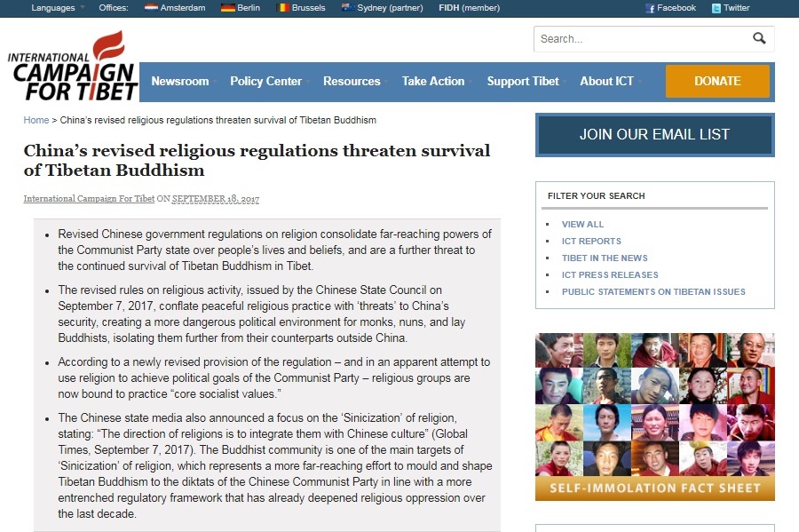 国际声援西藏运动主席马提奥•梅卡奇(Matteo Mecacci)在报告中指出,中共修订宗教条例,显示无神论政府对人民生活的侵犯程度。当局致力于消除“外部”影响力,意即要确保藏人无法接触他们的精神领袖达赖喇嘛尊者。