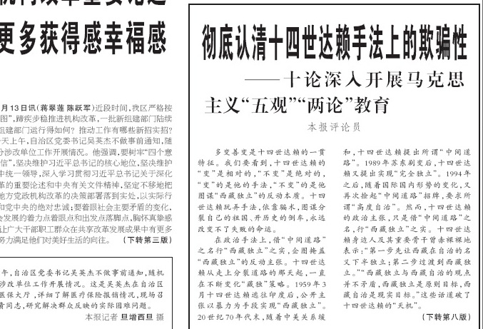 这三篇文章皆以“论深入开展马克思主义‘五观’‘两论’教育”为副标题,格桑坚参质疑说,近期中共在西藏自治区内开展所谓马克思主义“五观”和“两论”教育,在整个中国大陆没有一个市场的“马克思主义理论”,为什么要在西藏重新大张旗鼓地进行宣传呢?“其原因有两点:第一,现在整个西方社会正在抵制中共的这一理论。这些理论在中国没有走上任何市场,因此重新把这些理论在西藏宣传起来;第二,由于西方与北京之间的对立,中共的民族主义情绪高涨,因此在所谓《西藏日报》上连续发表文章,这些文章里主要针对的是达赖喇嘛尊者。”
