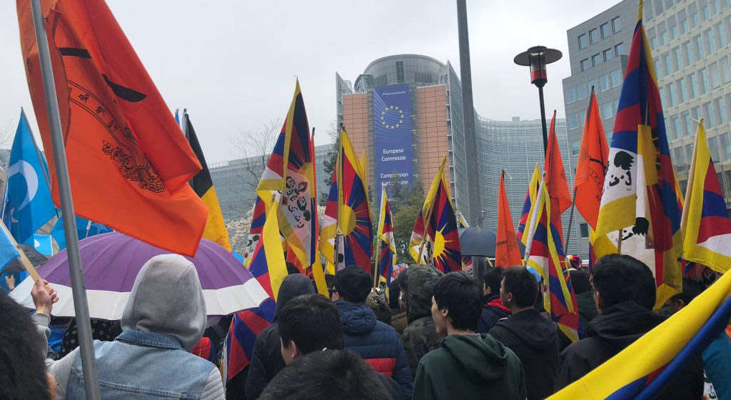 根据本台驻瑞士记者发来的消息指出,在欧中峰会当天,抗议者们聚集在布鲁塞尔欧洲议会附近,挥舞西藏与东突厥斯坦旗帜、高喊各种口号,并呼吁欧盟委员会主席以及欧洲理事会主席优先考量西藏境内和新疆人权的问题。