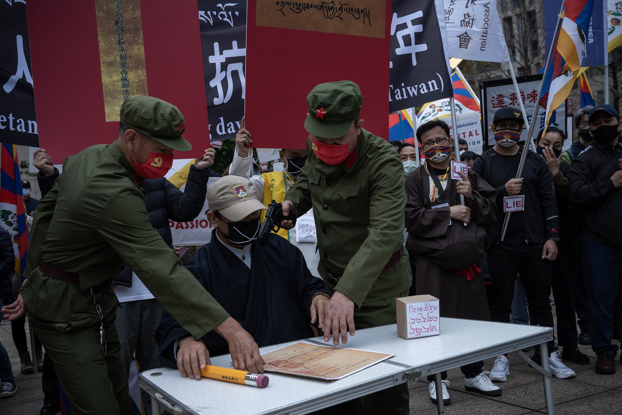 同时,活动人士高举中文和藏文版本的十七条和平协议,并邀请现场的游行参与者贴上“谎言”、“LIE”的字条,而藏人透过行动剧想告诉台湾民众“和平协议看西藏、一国两制看香港”,千万不要被中共的谎言所欺骗。