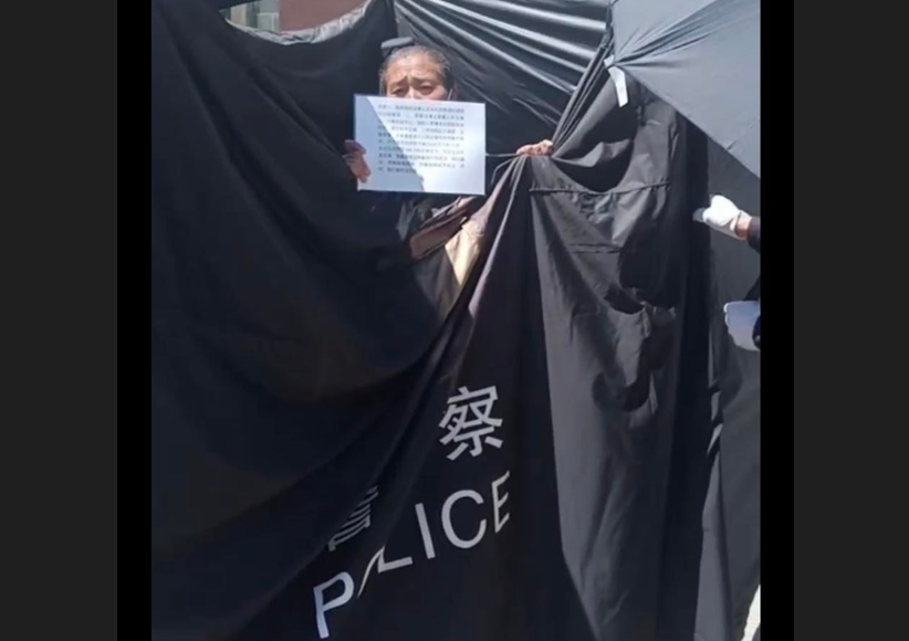 近年来中国民间频频发生各种维权活动,中国警方为阻止围观者用手机拍下抗议事件而开始采取新的镇压方法,用数人一组的方式持巨幅蓝色或黑色布幕,迅速遮挡住抗议者,然后进行拘捕,这一当局新发明镇压手段被网友讥为“遮羞布”。而近日,拉萨市中共警方将“遮羞布”用在了为弟弟鸣冤请愿的藏人妇女贡布吉身上。