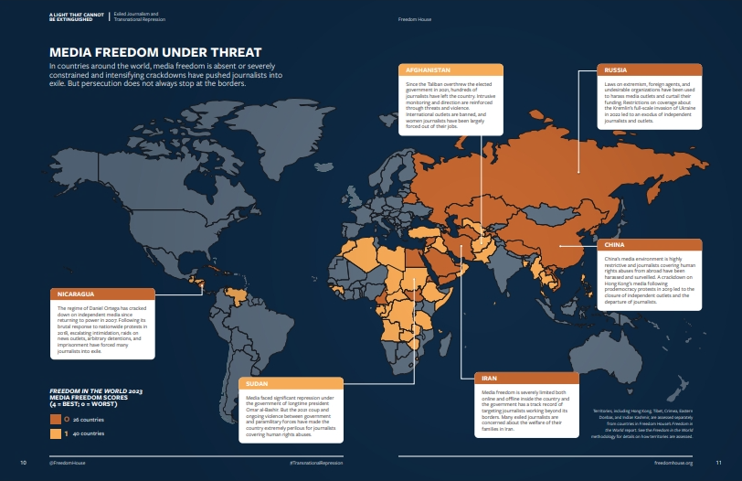 国际人权组织自由之家12月6日发布题为“无法熄灭的灯:流亡记者与跨国镇压”(A Light That Cannot Be Extinguished: Exiled Journalism and Transnational Repression)的报告,指中国等26个国家的政府正在透过人身攻击、拘留、绑架、限制行动自由、报复家属等方式,对海外的新闻工作者进行跨国镇压。