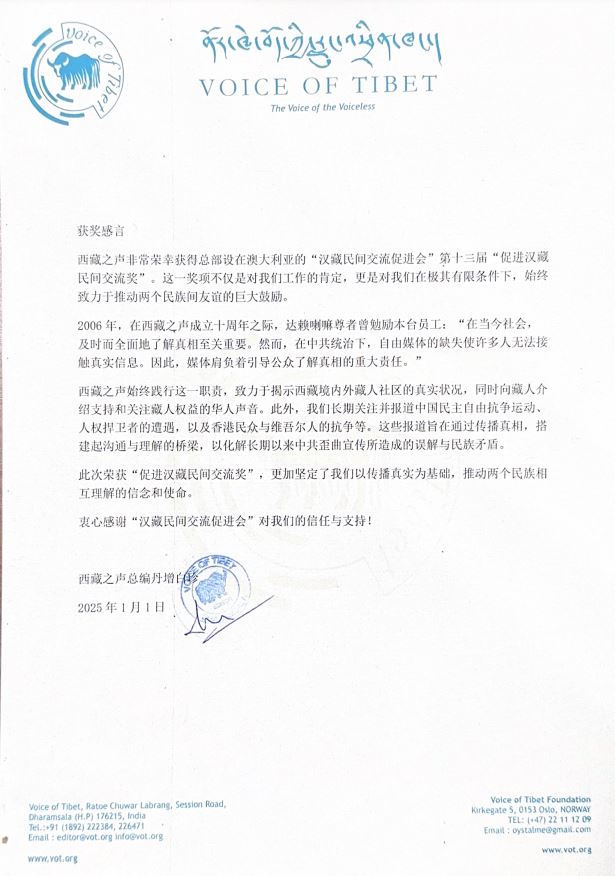 西藏之声总编丹增白珍在获奖感言中表示,“西藏之声非常荣幸获得总部设在澳大利亚的汉藏民间交流促进会第十三届‘促进汉藏民间交流奖’。这一奖项不仅是对我们工作的肯定,更是对我们在极其有限条件下,始终致力于推动两个民族间友谊的巨大鼓励。西藏之声希望通过传播真相,搭建起沟通与理解的桥梁,以化解长期以来中共歪曲宣传所造成的误解与民族矛盾。”