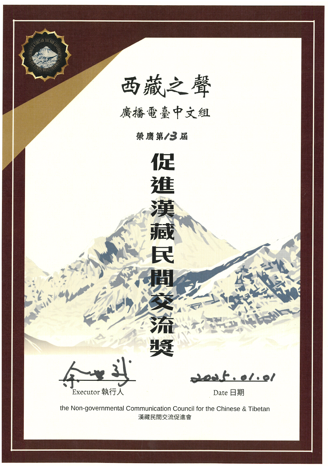 【西藏之声2025年01月02日报道】总部设在澳大利亚的汉藏民间交流促进会于1月1日宣布,将第十三届“促进汉藏民间交流奖”颁给西藏之声广播电台中文组,以表彰西藏之声向全球华人介绍西藏问题的真相,同时帮助各方进一步认识西藏的传统文化和民族特征,特别是达赖喇嘛尊者主张的中间道路。