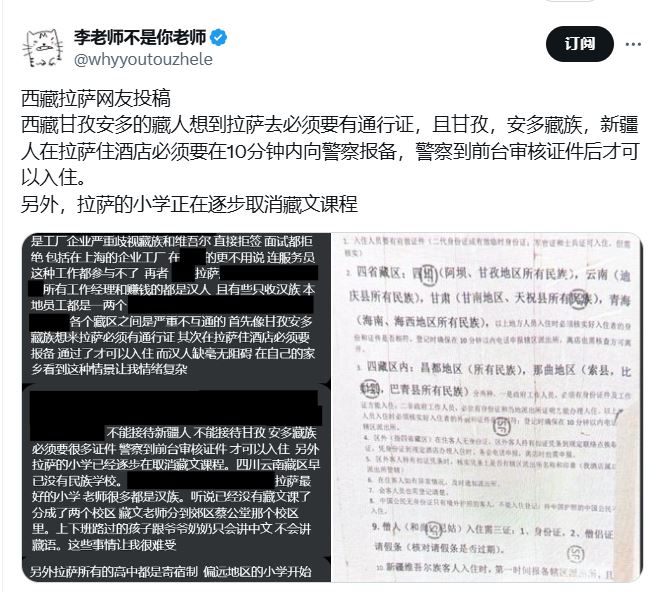 “李老师不是你老师”在贴文中说:“据西藏拉萨网友投稿,西藏甘孜安多的藏人想到拉萨去必须要有通行证,且甘孜,安多藏族,新疆人在拉萨住酒店必须要在10分钟内向警察报备,警察到前台审核证件后才可以入住。另外,拉萨的小学正在逐步取消藏文课程。”