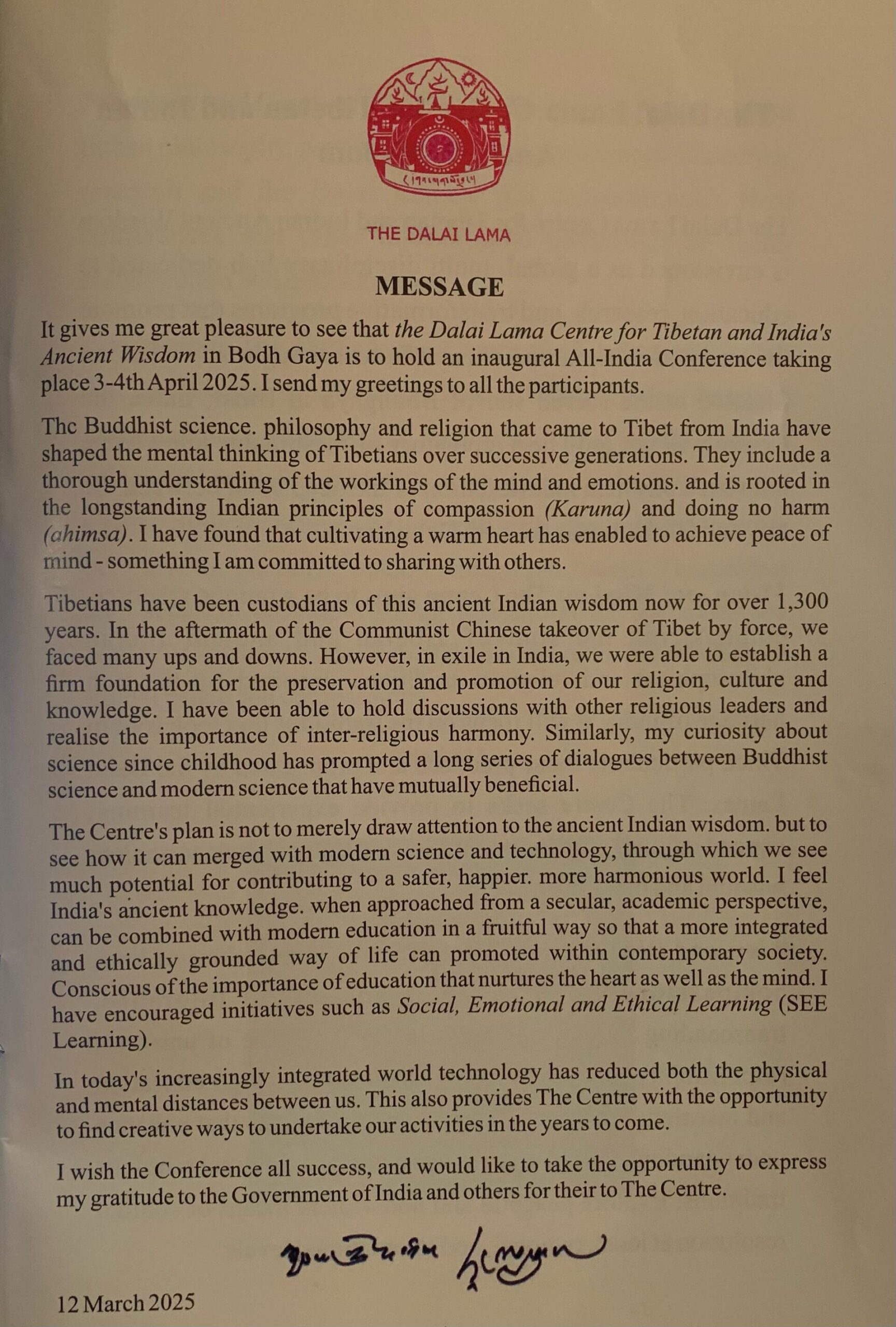 达赖喇嘛尊者在贺函中向所有与会人员表达问候的同时指出,达赖喇嘛西藏与古印度智慧中心的宗旨不只是为了关注古印度的文明,更是为了研究如何将这一文明与现代科学结合,为创造出一个更加安全、幸福与和谐的世界做出贡献。