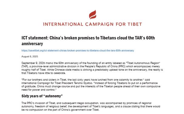 国际援藏团体“国际声援西藏运动”于8月6日在其官网发布声明指出,9月9日将迎来所谓“西藏自治区”成立60周年。作为中国设立的省级行政区,该“自治区”仅涵盖了整个西藏的一半。然而,尽管中国官媒高调宣传所谓的“繁荣发展”,现实中的藏人却“几乎没有任何值得庆祝的理由”。