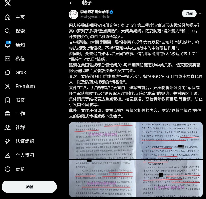 网名为“李老师不是你老师”的社交媒体X账号收到中国境内网友投稿成都网安内部文件:《2025年第二季度涉意识形态领域风险提示》。这份内部文件提到几项有关西藏的所谓“重点风险”。