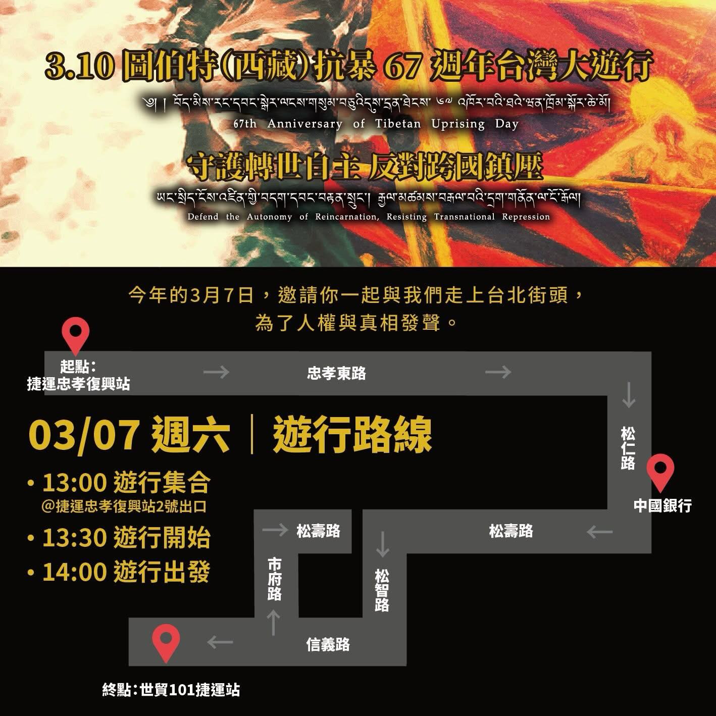随着3月10日“西藏自由抗暴67周年”纪念日临近,在台藏人福利协会、西藏青年会台湾分会等团体于7日在台北举行大规模游行。今年活动的主题定为“守护转世自由,反对跨国镇压”,旨在提醒国际社会及台湾民众关注中共日益扩张的极权输出,并捍卫西藏传统的宗教转世制度。