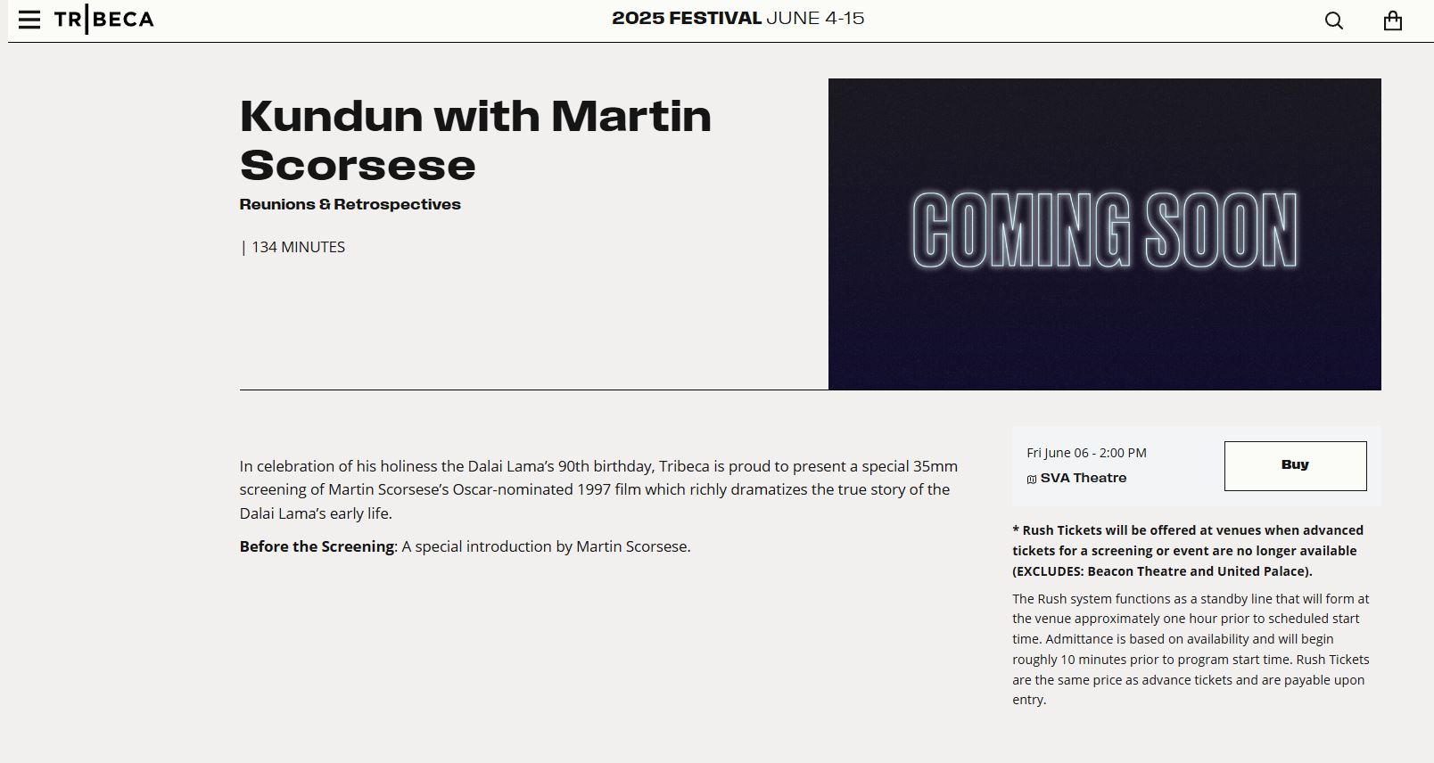 美国“翠贝卡电影节(Tribeca Festival)”宣布将于6月6日在纽约视觉艺术学院剧院放映记录达赖喇嘛尊者早期人生经历的电影《Kundun》,以庆祝尊者90岁生日。《Kundun》这部电影由好莱坞著名导演马丁·斯科塞斯(Martin Scorsese)拍摄,并且获得奥斯卡提名。翠贝卡电影节官网已经开始售票。