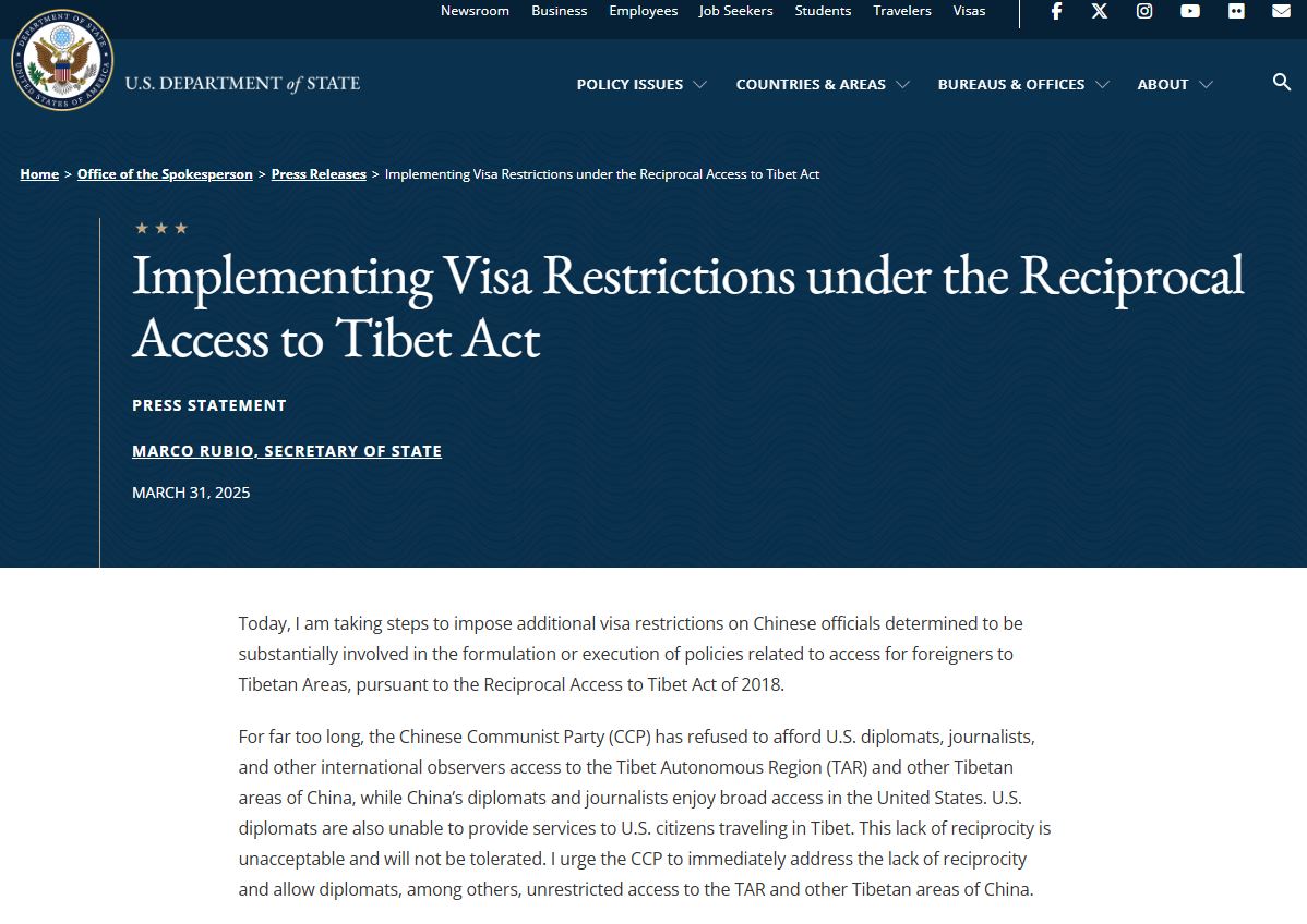 美国国务卿马克·鲁比奥于3月31日宣布,根据《西藏旅行对等法》,对“确定实质性参与制定或执行外国人进入西藏政策”的中共官员实施签证限制。美国国务院在其官网发布了鲁比奥的这一新闻声明。