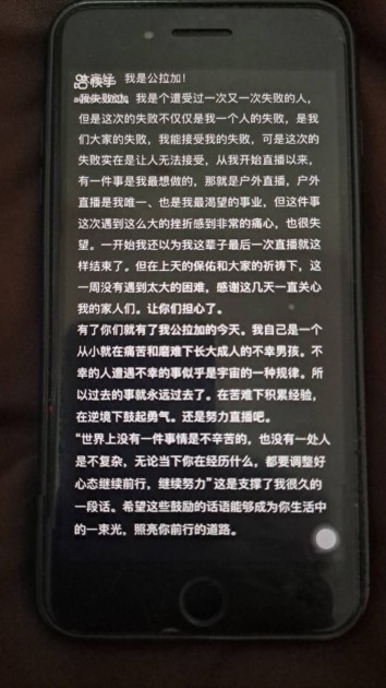 公拉加说:“我失败过,我是个遭受过一次又一次失败的人,但是这次的失败不仅仅是我一个人的失败,是我们大家的失败,我能接受我的失败,可是这次的失败实在是让人无法接受,从我开始直播以来,有一件事是我最想做的,那就是户外直播,户外直播是我唯一、也是我最渴望的事业,但这件事这次遇到这么大的挫折感到非常的痛心,也很失望。一开始我还以为我这辈子最后一次直播就这样结束了。但在上天的保佑和大家的祈祷下,这一周没有遇到太大的困难,感谢这几天一直关心我的家人们。让你们担心了。”