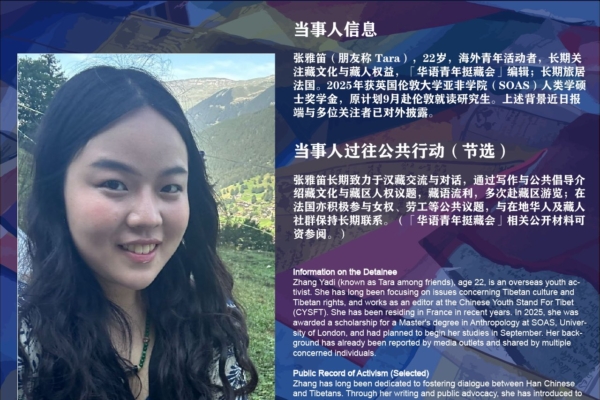 【西藏之声2025年9月20日报道】现居法国、长期关注民族问题,推动民族对话,促进汉藏理解的援藏人士张雅笛于今年7月返回中国长沙探亲后,与外界失联已47天。名为 “华语青年挺藏会”的X账号发布声明,呼吁中共当局立即无条件释放张雅笛,确保司法公正,杜绝非人道待遇。此外,援藏组织“自由西藏”也发布声明,指出张雅笛的失踪凸显了致力于对话与理解的年轻中国和西藏民众所面临的极端风险。